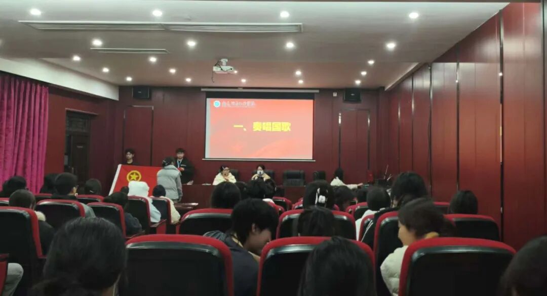 仪式在雄壮激昂的中华人民共和国国歌声中拉开帷幕,全体人员肃立齐唱,激昂的旋律点燃了现场每一位青年学子的爱国情怀与青春热情,也为这场意义非凡的入团仪式奠定了庄严的基调。
