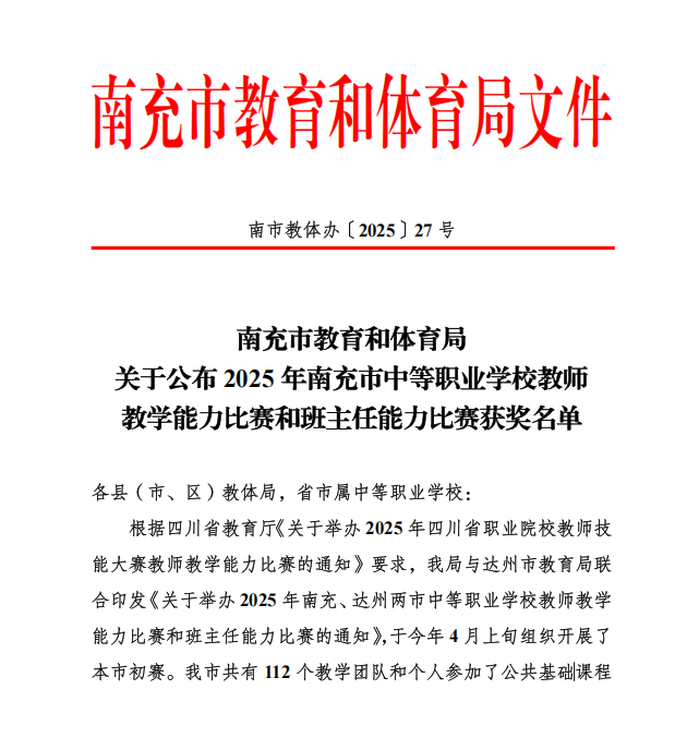 【喜报】热烈祝贺我校教师在2025年南充市中等职业学校教师教学能力比赛和班主任能力比赛中再获佳绩!